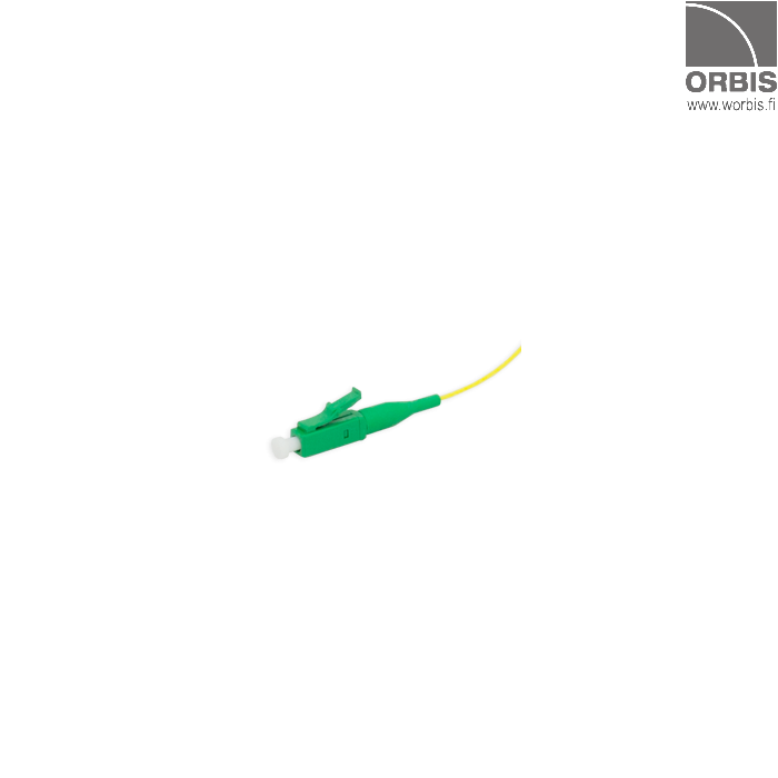 Häntäkuitu (pigtail) LC-liitin, yksimuoto (SM) G.652D APC-hiottu kuitu, liitin vihreä, kaapeli keltainen. Pituus 2,0 m. Paketissa 12 kpl häntäkuituja.